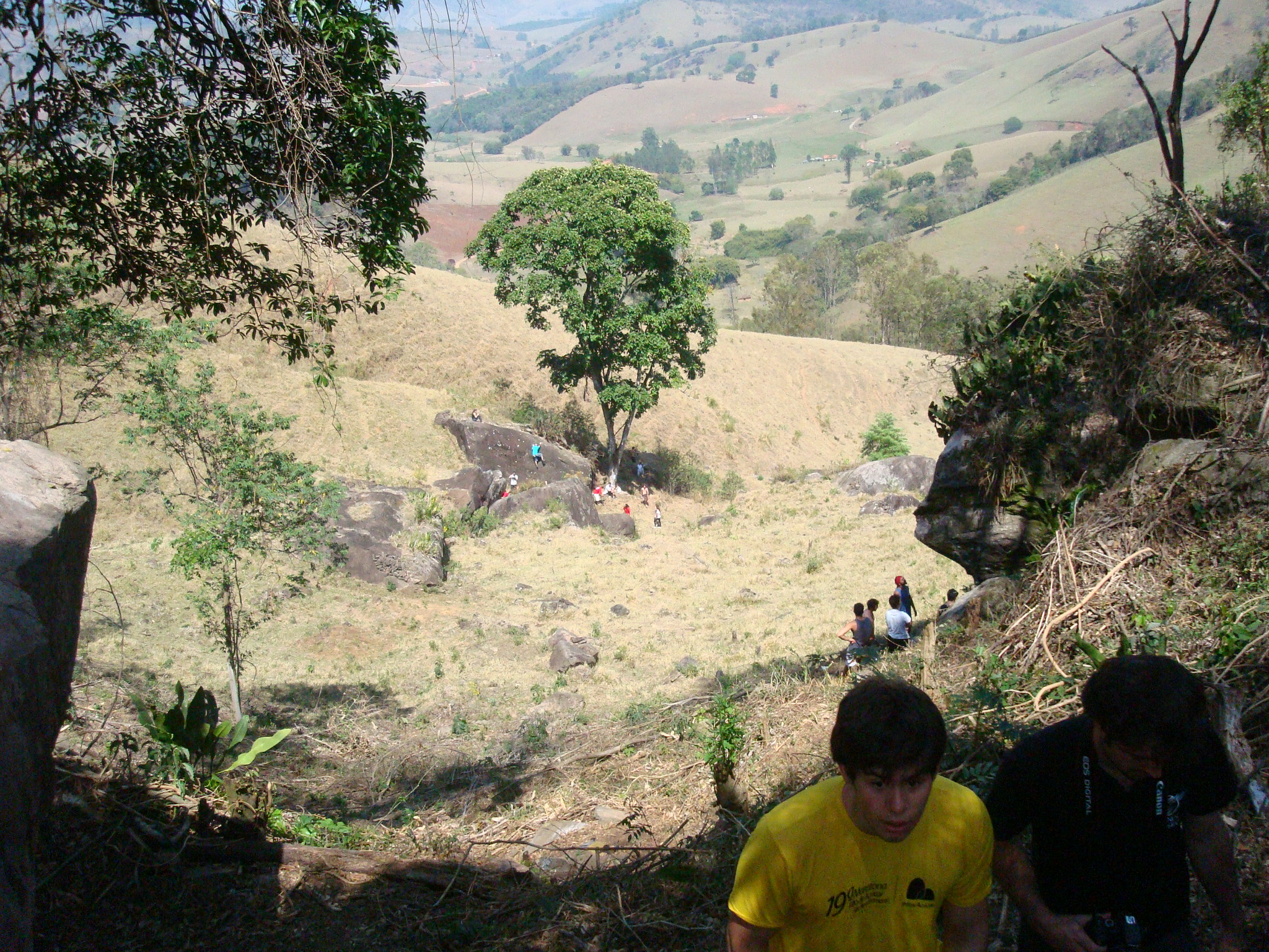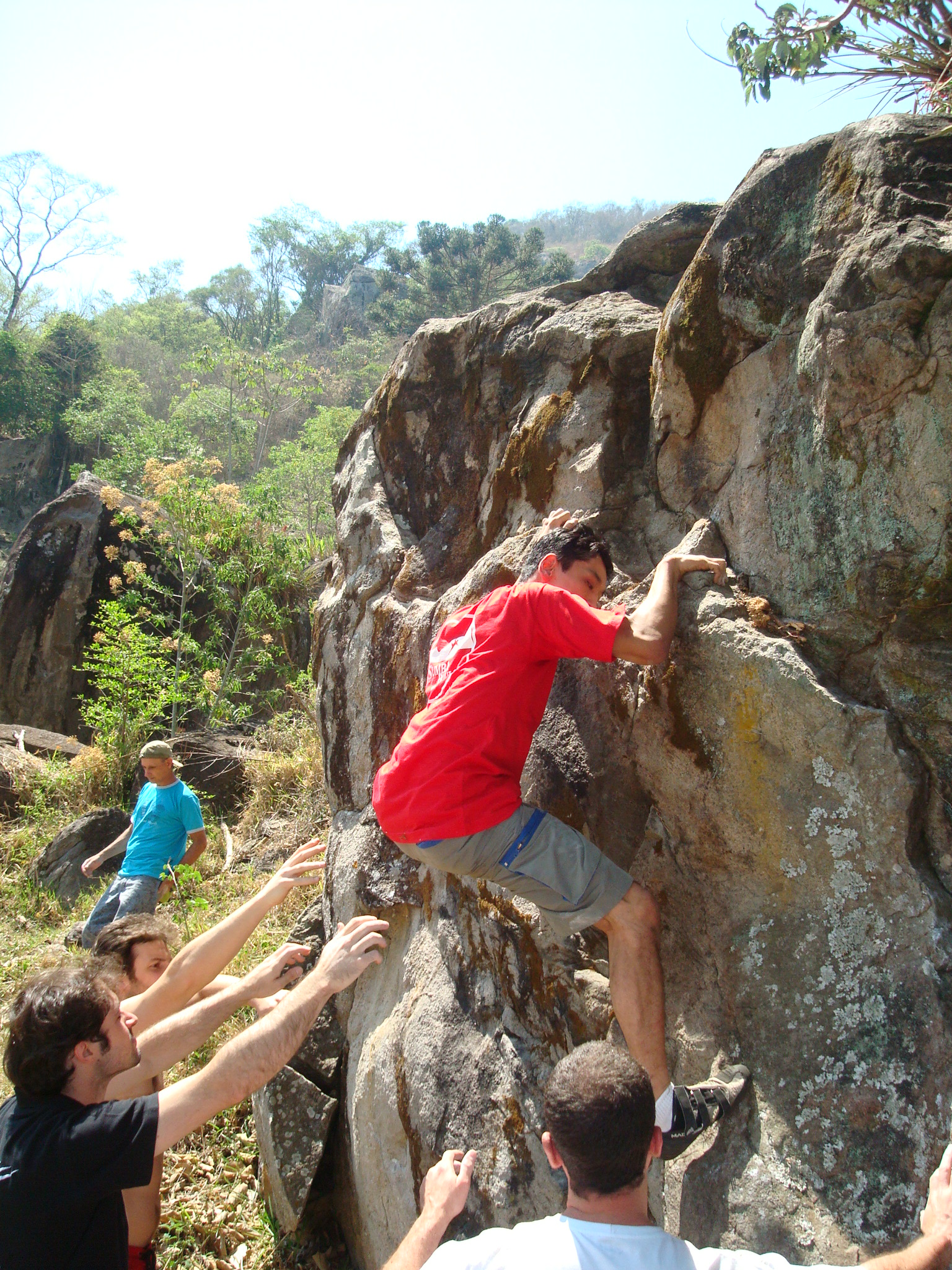O local da escalada já era em terras mineiras, o acesso é bem fácil, me lembra a piramba para acessar a Falésia Paraíso, só que mais íngreme e longa… e cheio de uns matos com espinhos, passado essa trilha, você chega as blocos, e alguns deles bem perto de pirambas que davam medo, logo percebemos que o pessoal teve muito trabalho parar limpar o local, terraplanar alguns pontos, arrumar a trilha e ate construir uma espécie de deck em dos boulder, realmente a Organização estava muito boa!!!!
