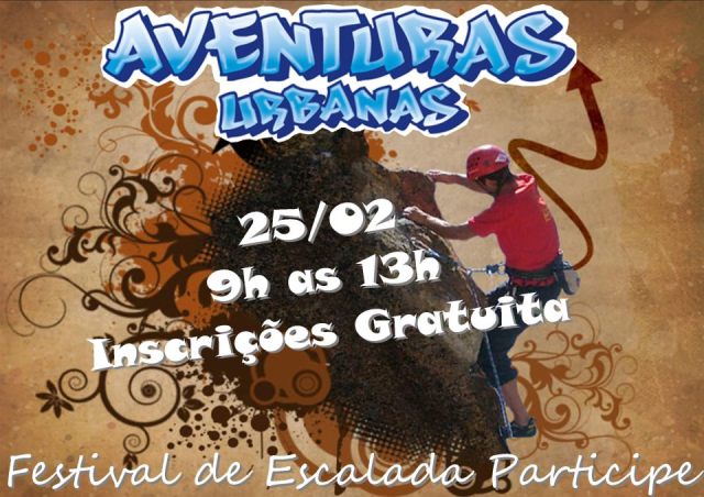 Aventuras Urbanas que atende jovens (andantes e cadeirantes) Carentes da Grande São Paulo com aulas de escalada Esportiva,skate, Parkour e streetball são jovens fantásticos que estão escalando bem!! E no próximo dia 25/02 teremos o segundo Festival de Escalada, com inicio as 9:00h com a categoria infantil até 12 anos de das 10:00 as 13:00h com categorias acima de 13 anos!! Todos estão convidados a brincar e se divertir um pouco com no CEU CIDADE DUTRA, inscrições gratuitas!! Vamos prestigiar a garotada!!