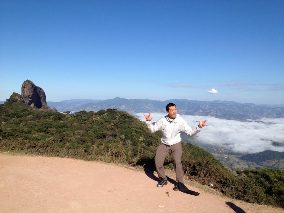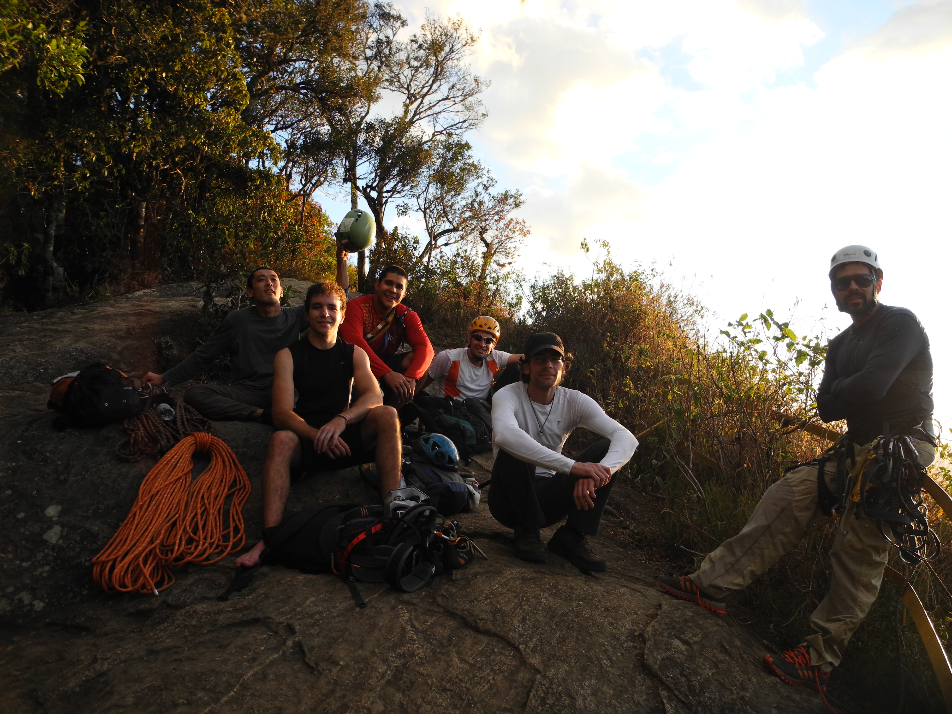 Depois de treinar para melhorar o preparo físico, marcamos de escalar a via Galba Ataide no Bauzinho em São Bento do Sapucai – SP no dia 24 de Agosto, participaram dessa aventura o Daniel de Andrade, Alexandre Karam, Victor Hugo Germano, Davi Caetano e Lucas Genofre, apesar das melhoras para eu andar, os lideres dessa escala Ale e Victor optaram por descer de rapel ate a base, sem duvida o rapel mais tenso que eu já fiz, pois a via tem cerca de 150 metros e descer nunca é tão legal quanto escalar, com todos na base da via começamos a escalar. A saída da via é bem estranha, precisa trabalhar bem a perna, e eu precisei de algumas tentativas para faze-la, após essa saída a via fica bem tranquila ate a primeira parada, para chegar ate a segunda para existe um crux, com uma movimentacao que eu nao estou acostumado a fazer, existe uma barriga que para passar deve-se fazer uma oposição jogando o corpo para esquerda, subir o pé direito bem alto, quase na altura da mão, montar no pé direito, ganhar altura, depois na mão esquerda tem uma abaulada, ganha mais altura e bate num agarra boa mais a cima, para resumir é quase uma virada de boulder a uns 40 metros de altura, na segunda cordada fica o crux da via, um lance de aderencia bem ruim também, existe um mão bem mais ou menos e deve usar os pés em pequena saliências que para mim não rolava, minha movimentação das pernas ainda não é la grande coisa e o cansaço estava bem forte, enfim não teve jeito, precisei roubar rs , o Ale prevendo essa situação, montou um corrimão unindo varias fitas! o Lucas foi o unico que mandou o lance, já que o Ale, Victor e Davi estavam la para ajudar na logística e filmar nossa escalada, após o esse cruz tudo fica mais fácil! a quarta e ultima enfiada é a mais tranquila, ainda bem pois o cansaço estava enorme, a escalada demorou um pouco mais que o previsto, pois começamos a descer umas 10h30 e chegamos no cume umas 17h30.