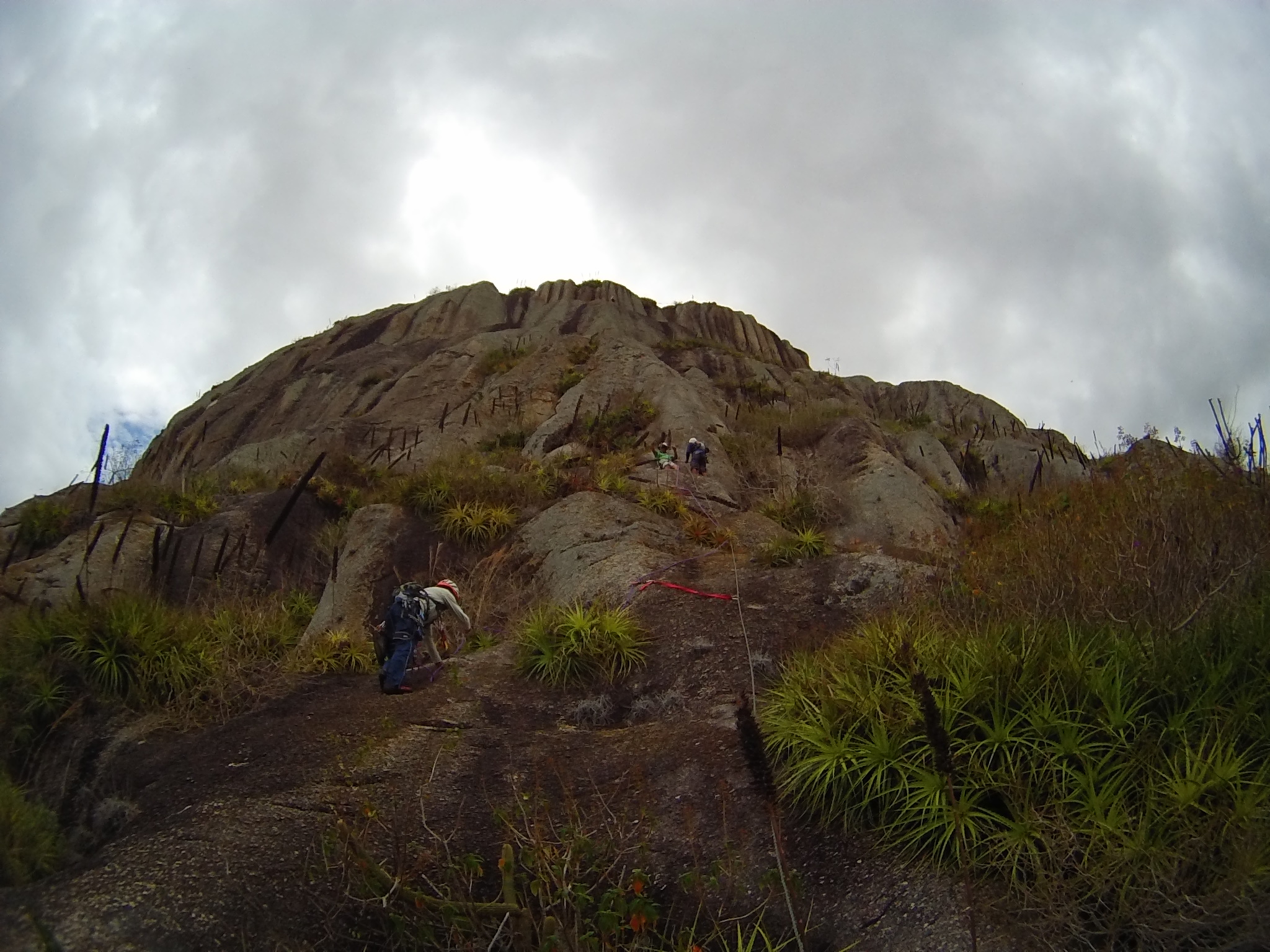 Quinta rolou mais um climb, na Pedra do Banguelo, localizado na cidade Mogeiro, bem próximo de Campina Grande. Paramos o carro antes da porteira que leva a trilha e já tivemos que ir com cautela, as vacas esta de olho e meio arriscas, passado esse crux continuamos na trilha, andamos e andamos e Pablo com seu condicionamento físico ruim rs pediu para fazer uma pausa e tomar água no Camp 1 debaixo de uma grande arvore,  após alguns metros de caminhada, chegamos a parte em que a mata fica mais alta, não achamos a trilha direito então andamos no meio da arvores secas e espinhosas…. mas sem macambira na trilha… ufa…. chegando na base da pedra, mais umas goladas de água, equipar e começar a subir pela Via Seleção Natural (acho que é 4o com V de 140 metros) na primeira parte da escalada tem um lance bem chato que o Pablo não conseguiu passar de primeira e eu  tentei de todas formas “roubar” ate chegava na agarra, mas como não sabia como era a outra agarra sempre ia com medo e vacava, cai muitas vezes, foi o tempo para Pablo descansar e depois mandar o lance…… continuando…. teve uma parte que eu agarra de mão quebrou e adivinhem onde eu vaquei?? num belo “ninho” enorme de macambiras! só não me ferrei porque estava com a mochila de ataque e de calças…. mais acima chegou o crux de aderência, o Pablo pediu para eu mandar, eu não guio, mas ou guiava ou acabava a escalada…. consegui ficar de pé…. para não cair usei o pé no P mesmo, mas a agarra para passar o lance era um batente ao contrario e dos dois lados cheio de peste macambira… eu gritava vou cair e Pablo cai não porrra…. e o Elvis baixou…  e ai não teve jeito, usei a agarra de mão direita nas macambiras, não queria cair hahahaha, vejam a foto de como ficou, passei o lance, parei no plato e pedi para o Pablo continuar, pois estava todo cortado… depois foi só alegria, cume, fotos e a parte radical rapelar…… mas antes de chegar no carro, outro crux, dessa vez as vacas se juntaram em maior quantidade e estavam nos cercando…. eu já ia correr… mas fui contido! começamos a gritar feito doido e deu certo rs
