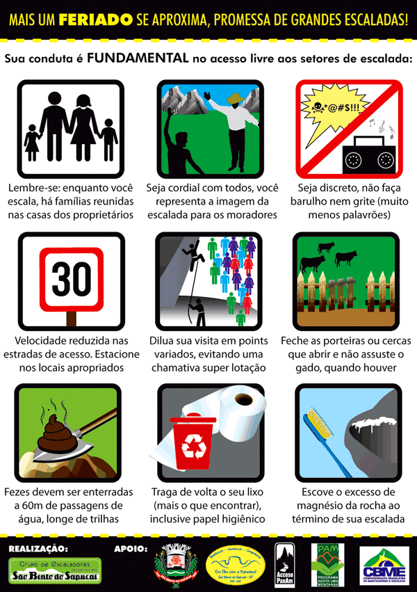 O feriadão da Semana Santa costuma marcar o início da tão aguardada temporada de escalada no país. Um momento mais que propício para difundir bons valores e ajudar a fazer desta uma temporada exemplar, repleta de muita evolução para todos os escaladores e também para os points de escalada! Para quem vem à região de São Bento do Sapucaí, aqui vão algumas dicas importantes de comportamento:
