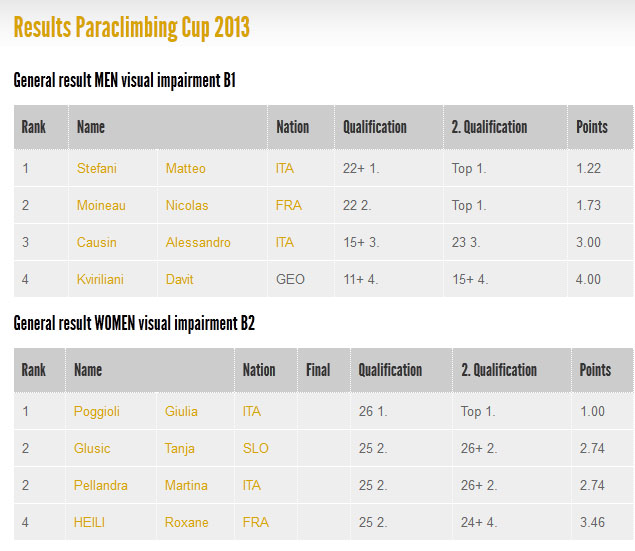 No ultimo dia 06 de Setembro rolou um Campeonato de Paraclimbing no famoso evento Rock Master e com duas novidades em relação ao Mundial em 2012, a primeira que a categoria neurological physical desability foi quebrada em dois, A e B separando os atletas com maior dificuldade motora dos que tem menos, através das notas dos coeficientes que multiplicam os pontos a segunda novidade foi a criacao da categoria para cadeirantes, esse foi um item que gerou muita discussão la no Mundial, pois os cadeirantes competiram na neurological physical desability, algo que no meu ponto de vista foi muito injusto!!!