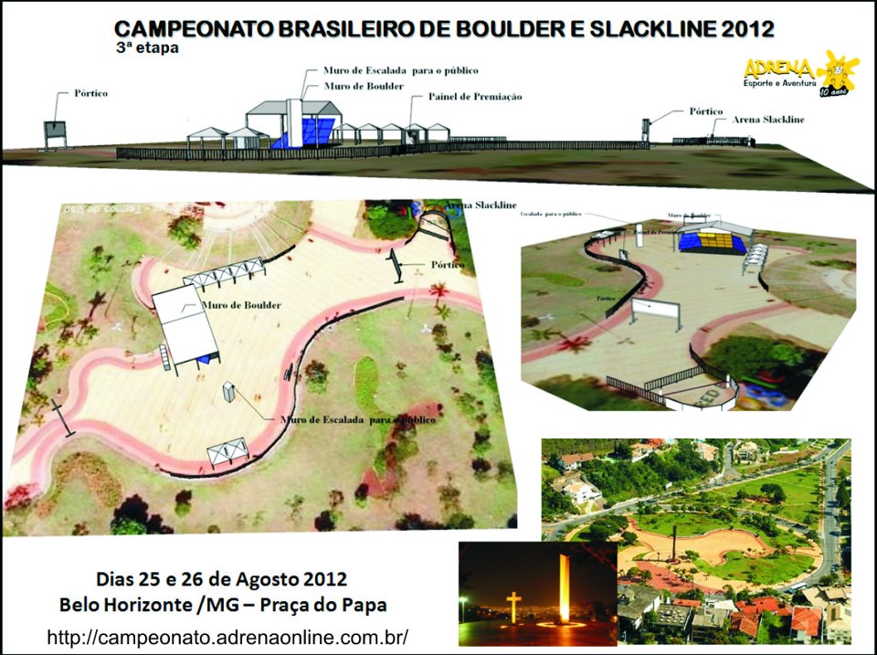 Após o sucesso da 1ª Etapa realizada na Urca no Rio de Janeiro e a 2ª etapa realizada na cidade paulista São Bento do Sapucaí, chegou a hora de Belo Horizonte sediar a final do campeonato brasileiro de Boulder realizado pela Adrena Esporte e Aventura, em comemoração aos seus 10 anos de vida, que acontecerá nos dias 25 e 26 de agosto de 2012. O evento vai acontecer no cartão postal de Belo Horizonte a Praça do Papa. Pela primeira vez, na capital mineira, um campeonato de escalada será realizado em praça pública. A Praça do Papa fica no bairro Mangabeiras, situada ao pé da Serra do Curral, símbolo da capital mineira, a mais de 1.100m de altitude.