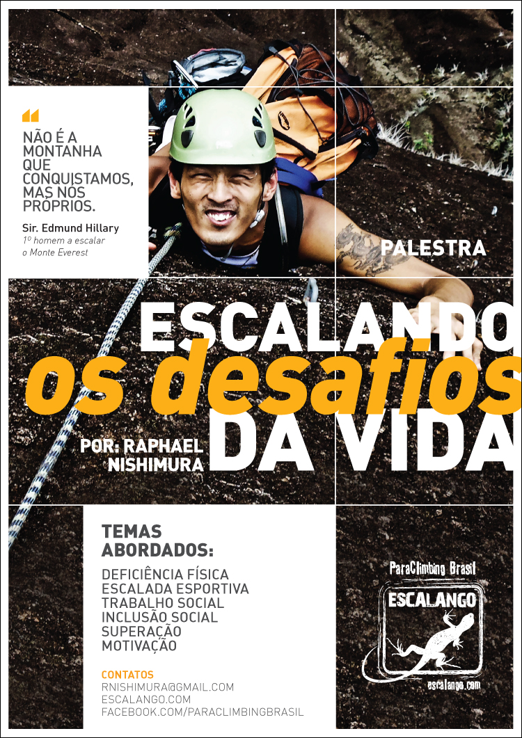 Temas abordados: através da deficiência física e da escalada esportiva eu falo sobre a busca por motivação, a importância da determinação para superar os desafios, a recompensa pessoal do trabalho social, a sensação de vitória ao superar seus medos e dificuldades, com muitas fotos e vídeos de escalada em lugares incríveis.